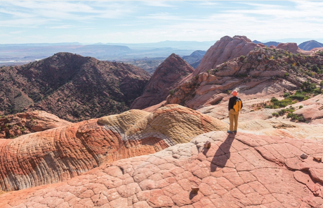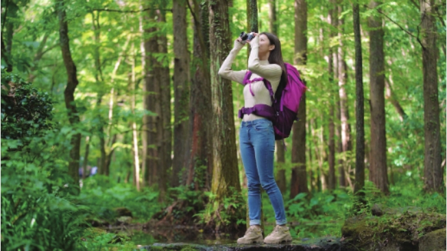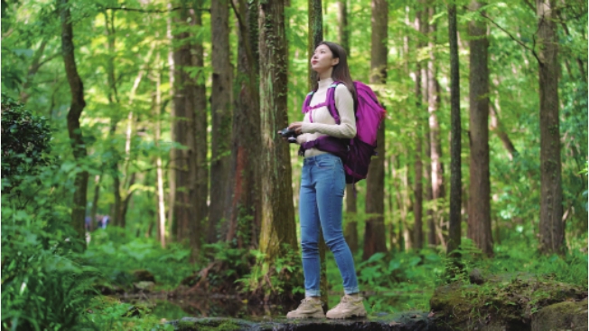 全景可用于表现人物与环境的关系,展示人物在某个环境空间内所进行的活动,是塑造环境中的人或物的主要手段,如图2-43和图2-44所示,主体人物是一位登山者,摄影师用全景画面描述了登山者在山中驻足停留并进行拍照这一个活动过程,清楚地介绍了人物动作和周边环境。
