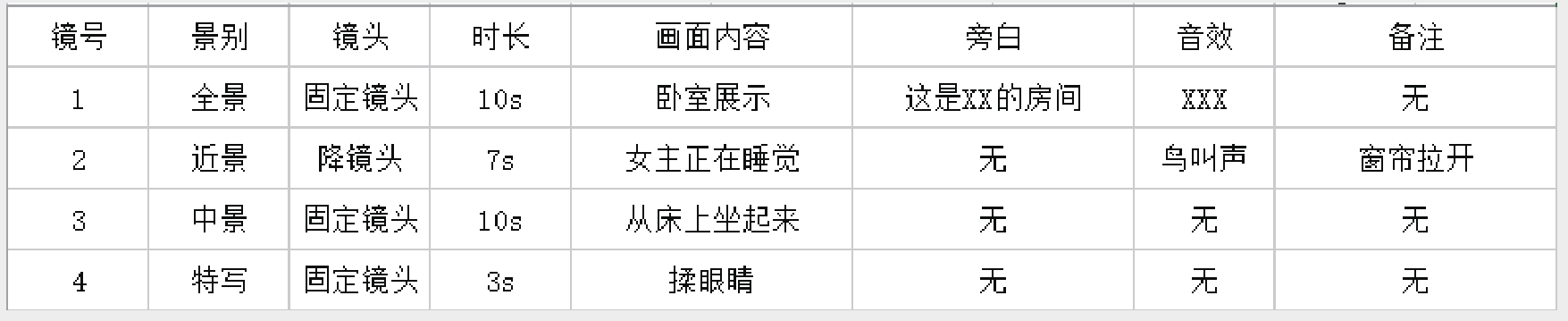 分镜头脚本是将文字转换成用镜头直接表现的画面,包括场景、景别、服装、角度、道具、机位等,下面逐个介绍这些概念。