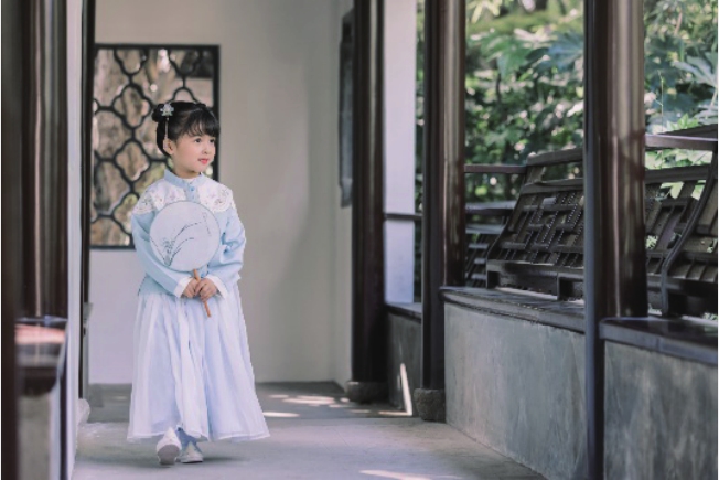 这里所说的服装,就是指根据场景和角色设定搭配的衣服、鞋子、首饰等。如果要拍摄人物在古镇或古风建筑内游玩的视频,那么穿上汉服便能很好地与周围环境相融,不会有突兀感,如图2-50所示。如果拍摄场景是在海边,那么选用泳装、海滩风,或者是颜色鲜艳的服装就更为合适。当服装色彩在画面中不够突出时,可以巧妙地搭配与画面色彩反差较大的装饰品(如围巾、帽子等)来突出人物主体,如图2-51所示。