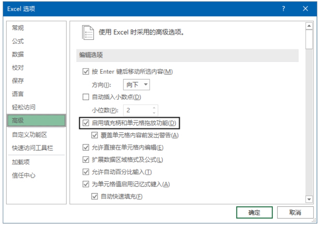 注意: 如果鼠标指针没有变为十字形,说明当前无法使用鼠标拖动填充柄执行填充操作。此时可以单击“文件”按钮并选择“选项”命令,打开“Excel选项”对话框,在“高级”选项卡中选中“启用填充柄和单元格拖放功能”复选框,即可启用单元格的填充功能,如图2-9所示。