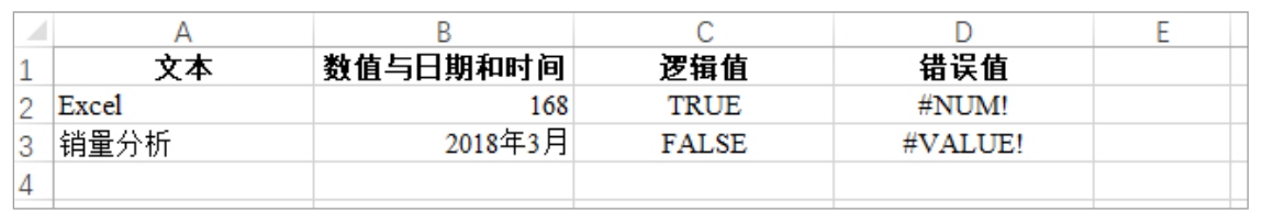 数据类型决定了数据在Excel中的存储和处理方式。Excel中的数据可以分为数值、文本、日期和时间、逻辑值和错误值5种基本类型,“日期和时间”实际上是一种特殊形式的数值。不同类型的数据在单元格中具有不同的默认对齐方式:文本在单元格中左对齐,数值、日期和时间在单元格中右对齐,逻辑值和错误值在单元格中居中对齐,如图2-1所示。