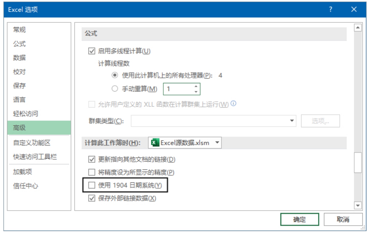 可以根据需要,在两种日期系统之间转换。单击“文件”按钮并选择“选项”命令,打开“Excel选项”对话框,在“高级”选项卡中选择所需的日期系统:取消选中“使用1904日期系统”复选框,表示使用1900日期系统,选中该复选框表示使用1904日期系统,如图2-2所示。