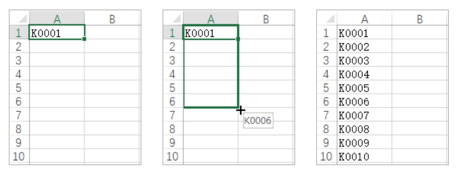如果编号由字母和数字组成,则只需在一个单元格中输入起始编号,然后拖动该单元格右下角的填充柄,即可在拖动过的单元格中自动输入连续的编号,如图2-12所示。