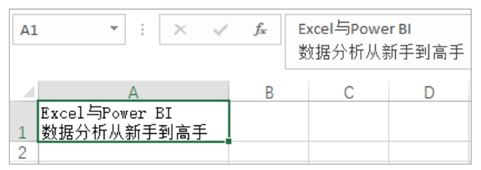 有时可能需要在指定的位置换行,而不是根据单元格的列宽由Excel自动控制换行位置。如果想要指定换行的位置,可以按F2键或双击单元格进入编辑状态,将插入点定位到要换行的位置,然后按Alt+Enter快捷键在该位置强制换行。如图2-19所示为A1单元格中的内容手动换行的效果,在编辑栏中也会显示手动换行后的格式。