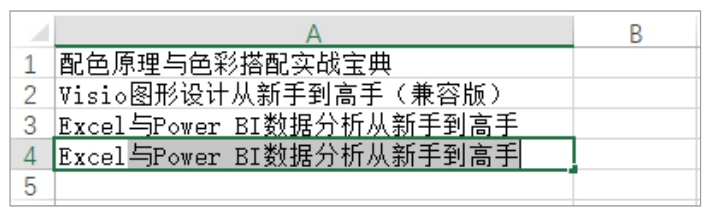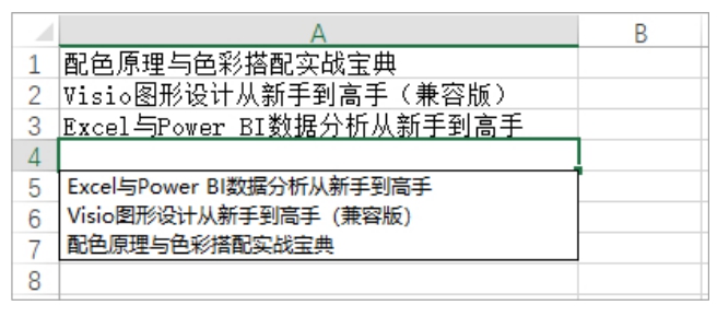 默认情况下,如果正在输入的内容与其同列上方的某个单元格中的内容相同或相似,Excel会自动使用匹配的内容填充当前单元格,填充部分高亮显示。如图2-21所示,当在A3单元格中输入字母E时(大小写均可),Excel将在该字母的右侧自动添加“Excel与Power BI数据分析从新手到高手”,这是因为A2单元格包含以字母E开头的内容“Excel与Power BI数据分析从新手到高手”,Excel将其识别为与所输入的字母E匹配的完整内容。