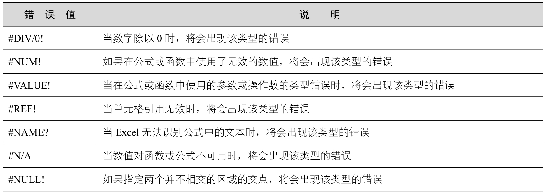 表2-1 Excel中的7种错误值