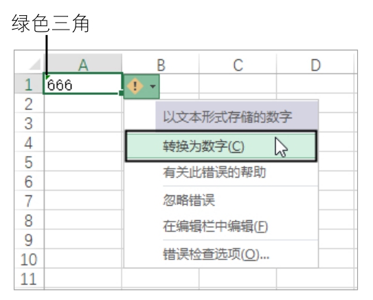 ,单击该按钮,在弹出的菜单中选择“转换为数字”命令,如图3-32所示。