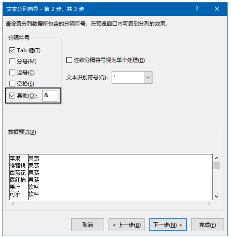 (4)显示如图3-25所示的选项,选中“其他”复选框,并在右侧的文本框中输入“&”,然后单击“下一步”按钮。