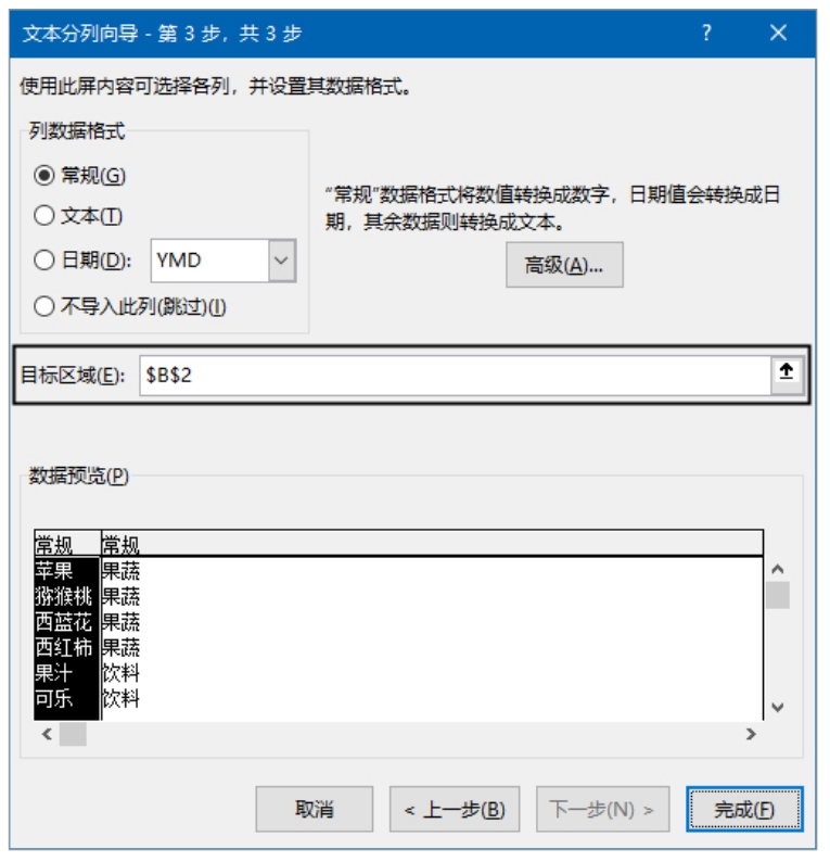 (5)显示如图3-26所示的选项,在“目标区域”中指定分列后数据区域的左上角位置,然后单击“完成”按钮,即可将B列数据拆分为两列。用户可以为拆分后的两列数据设置合适的列标题,如图3-27所示。
