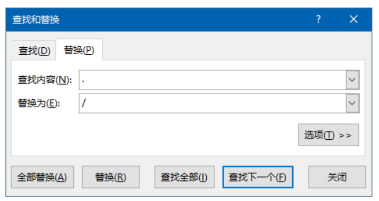 (2)打开“查找和替换”对话框中的“替换”选项卡,在“查找内容”文本框中输入“.”,在“替换为”文本框中输入“/”或“-”,然后单击“全部替换”按钮,如图3-29所示。