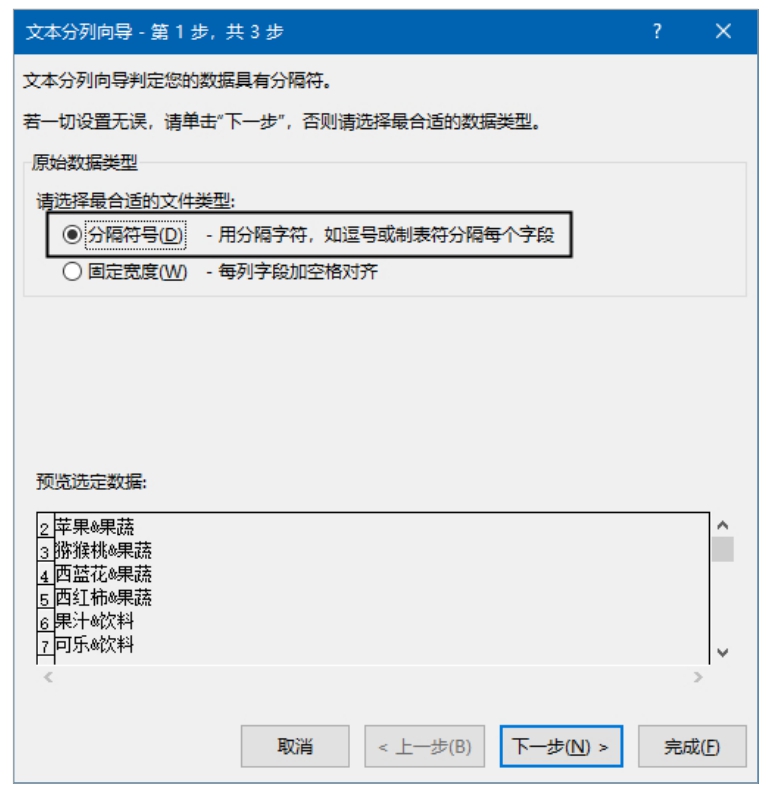 (3)打开“文本分列向导”对话框,选中“分隔符号”单选按钮,然后单击“下一步”按钮,如图3-24所示。