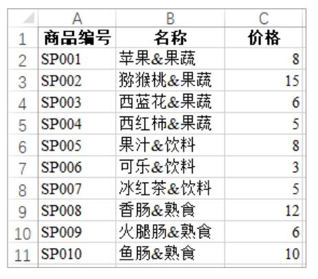在将由其他程序导出的数据导入Excel后,一些数据的格式可能不符合Excel格式规范。如图3-21所示,在B列中包含了商品名称和类别名称,它们之间以“&”符号分隔,为了便于单独处理商品名称和类别名称,需要将B列中的内容拆分为两列,使商品名称和类别名称各占一列。使用Excel中的“分列”功能可以轻松完成这项工作。