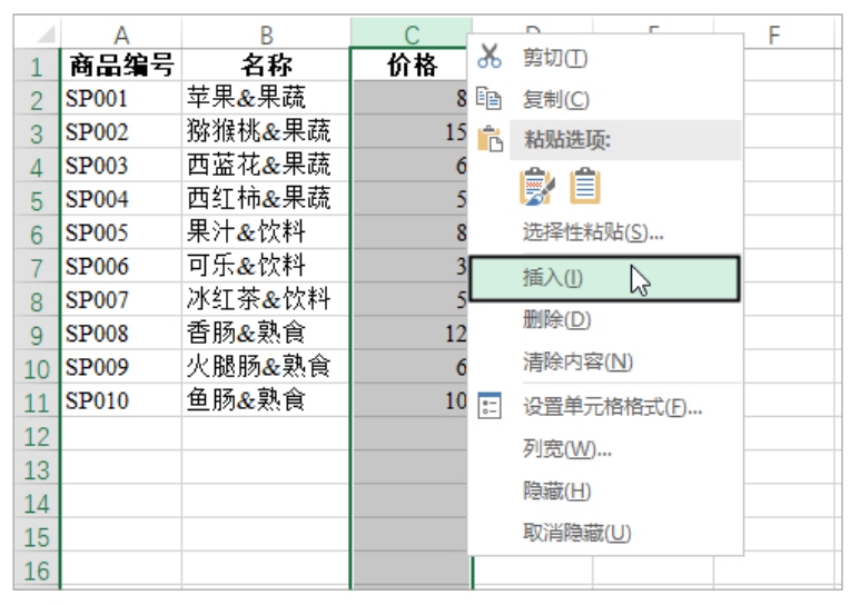 (1)右击C列的列标,在弹出的菜单中选择“插入”命令,在B、C两列之间插入一个空列,如图3-22所示。执行该操作是因为将B列内容分为两列后,其中的一列将会覆盖现有的C列,为了避免出现这种情况,需要提前插入一个空列。