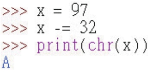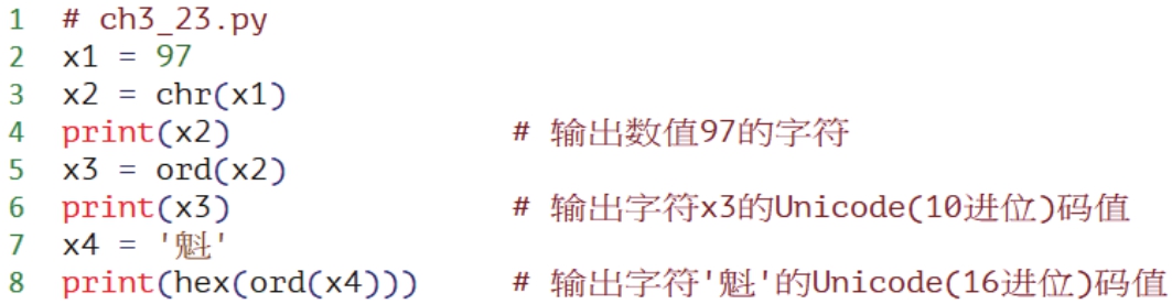 程序实例ch3_23.py: 这个程序首先会将整数 97 转换成英文字符 a ,然后将字符 a 转换成 Unicode 码值,最后将中文字“魁”转成Unicode码值。