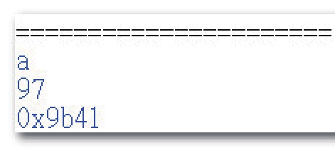 例如:从ASCII表可知,字符a的ASCII码值是97,可以使用下列方式打印出此字符。