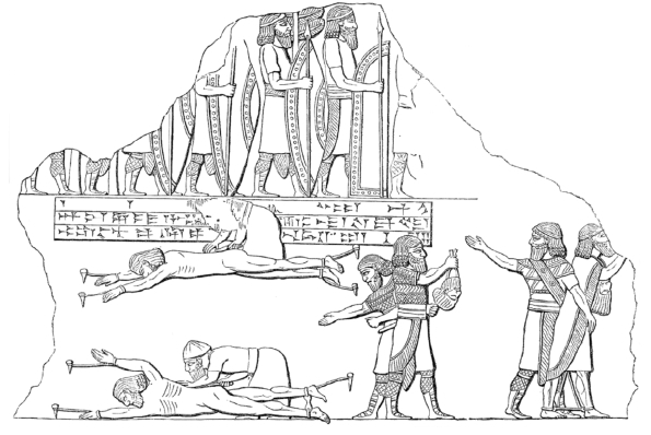 这幅图展现了两个战俘被亚述人活剥皮的场景,第3个战俘已经被斩首了。这种图像在当时是重要的宣传画。它昭示与亚述作对的人会受到严厉而残酷的惩罚,同时也是对邻国的一种警告。