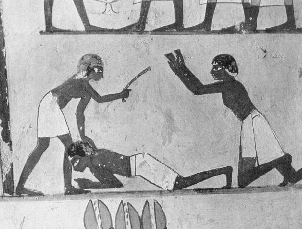 埃及的战俘或罪犯受到鞭笞。不能确定的是右边那个人到底是在恳求宽恕还是协助行刑。