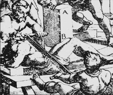 在这幅图中,标为”B的那个人正被锯成半。其实无须赘言都知道这种折磨是么的痛苦与缓慢。显然,这是一个死判决,但是,甚至他的下半身被锯掉时候,就像古代的术师在戏法中对待熊一样,他仍可存一段时间,直到最因失血而死。同时标为“A”的那个即将被斩首,这种决相对仁慈一些。
