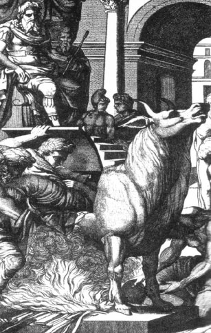 不幸的受害者被塞进“铜牛”,下面生起一大堆火。