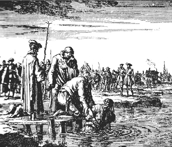 这幅图虽然描绘的是中世纪后期的一个场景,却展示了《汉谟拉比法典》所规定的一种“泳刑”。被控者的手脚被绑住,然后扔进河里。倘若他们成功穿越宽广的河面到达对岸,那么他们将被认为是无罪的。如果他们淹死了(这的确是大多数人的命运),则被认为是有罪。