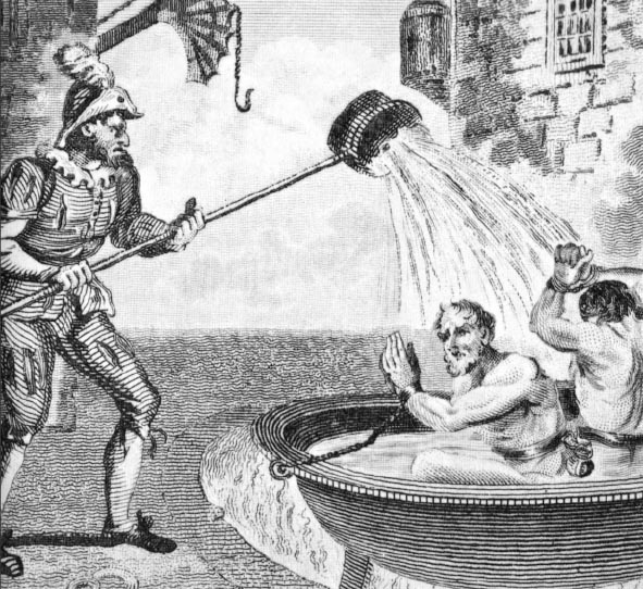 早期基督教的两个殉道者在沸油中迎接死亡。他们不仅被逼着在沸油中洗澡,同时还用沸油浇在头上沐浴,这进一步加剧了难以想象的痛苦。