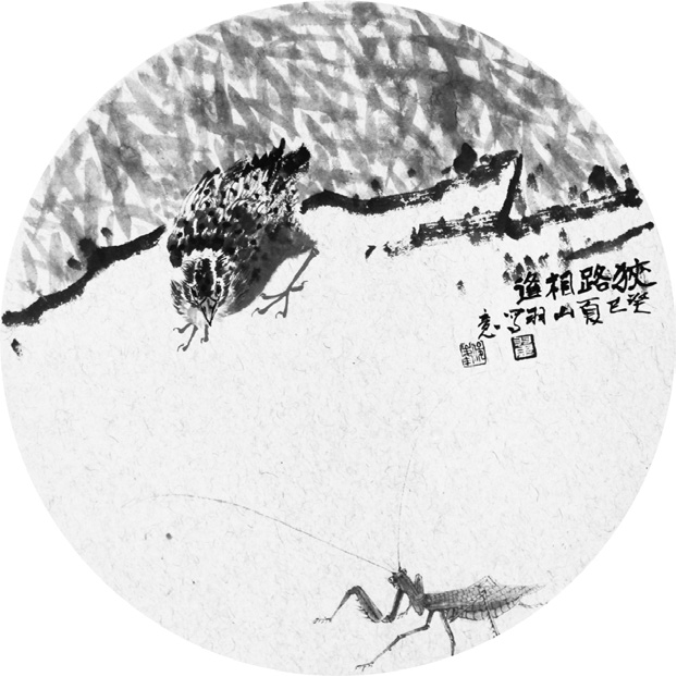 再看那只螳螂,似乎也没有发现大鸟的存在,因为它的眼中只有一只蝉,而这只蝉正在树荫里休息,也许是蝉自以为找到了安全之所,自顾自地享受,根本没有发觉危险的存在。
