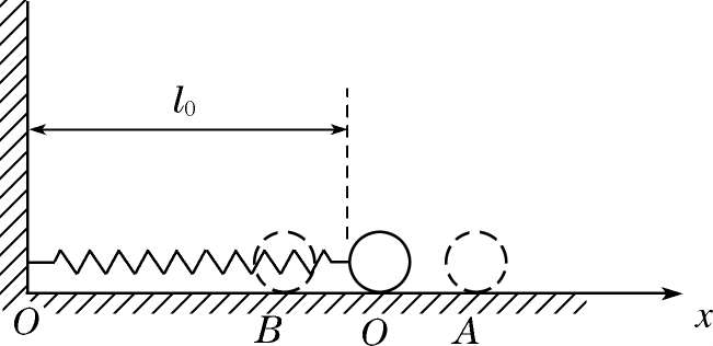 接下来我们以弹簧振子为例详细讨论简谐振动.如图4-1所示,长度为 l 0 的轻质弹簧(质量可以忽略不计)的一端固定,另一端连接一个质量为 m 的小球,放置在光滑的水平面上.当小球在水平方向不受外力作用时,弹簧处于自然长度 l 0 ,小球处于平衡位置 O 点.然后对小球施加一个向右的作用力,将小球拉至 A 点,然后无初速地释放,小球将在弹簧弹性恢复力的作用下从 A 点向 O 点运动.弹性恢复力指向 O 点,小球速度逐渐增大.当小球到达 O 点时,弹性恢复力为0,小球不受力的作用,但小球在惯性的作用下,通过 O 点继续向左运动.于是,弹簧开始被压缩,弹性恢复力仍然指向 O 点.在这个弹性恢复力的作用下,小球速度逐渐减小,直到减小到零并到达左边最远点 B 点.从 B 点小球再次开始加速向 O 点运动,整个运动过程与小球从 A 点向 B 点的运动情况相似.