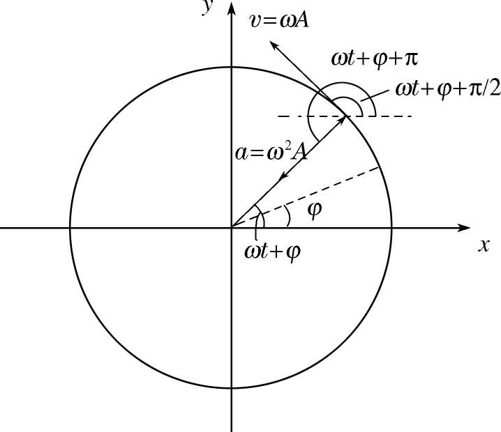 简谐振动位置和时间的函数关系还可以用旋转矢量的方法来表示.使用旋转矢量法的好处是可以直观清楚地给出简谐振动的各特征量(振幅、圆频率、相位)以及它们之间的关系.