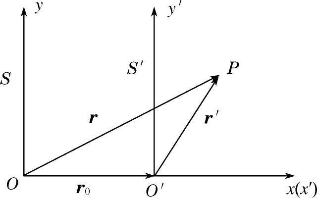 如图1-9所示,设 O - xy 为静止参考系 S , O' - x'y' 为运动参考系 S' .为简单计,假定对应坐标轴互相平行,且 S' 系相对于 S 系沿 x 轴做直线运动.在时刻 t ,设有一个质点位于空间某点 P ,它相对于 S' 系和 S 系的位矢分别为 r' 和 r ,而此刻 S' 系的坐标原点 O' 相对于 S 系的坐标原点 O 的位矢为 r 0 .由矢量的合成法则可以得到三个位矢之间的关系为