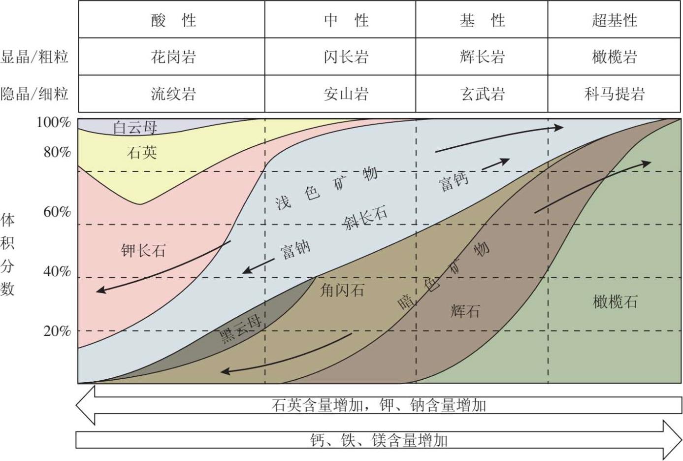 大部分火成岩是由硅酸盐岩浆冷凝而成的,在主量元素中,SiO 2 的含量最高,少数可达80%以上。一般情况下,随着SiO 2 含量的增大,Na 2 O和K 2 O的含量也随之增高,而重质金属氧化物(MgO、CaO、FeO)则相应减少。因此,岩浆中SiO 2 的含量是划分火成岩类型的主要依据。通常根据SiO 2 的质量含量将岩浆划分为四种基本类型:①超基性岩浆(SiO 2 <45%);②基性岩浆(SiO 2 =45%~52%);③中性岩浆(SiO 2 =52%~65%);④酸性岩浆(SiO 2 >65%)。