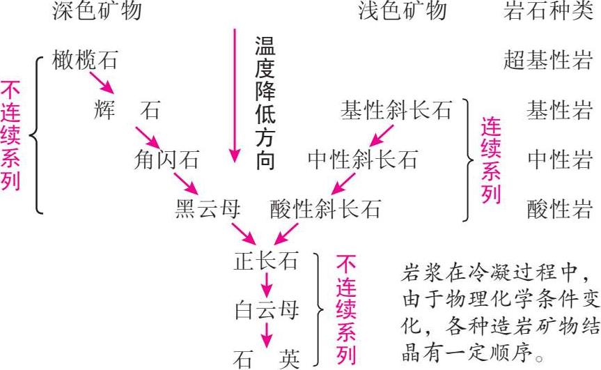 不同成分的矿物不仅颜色不同,在结晶环境上也具有较强的规律性。1922年,鲍温模拟了玄武岩岩浆的结晶作用,总结出玄武岩浆演化过程中矿物结晶的一般规律——鲍温反应系列(图2-4)。