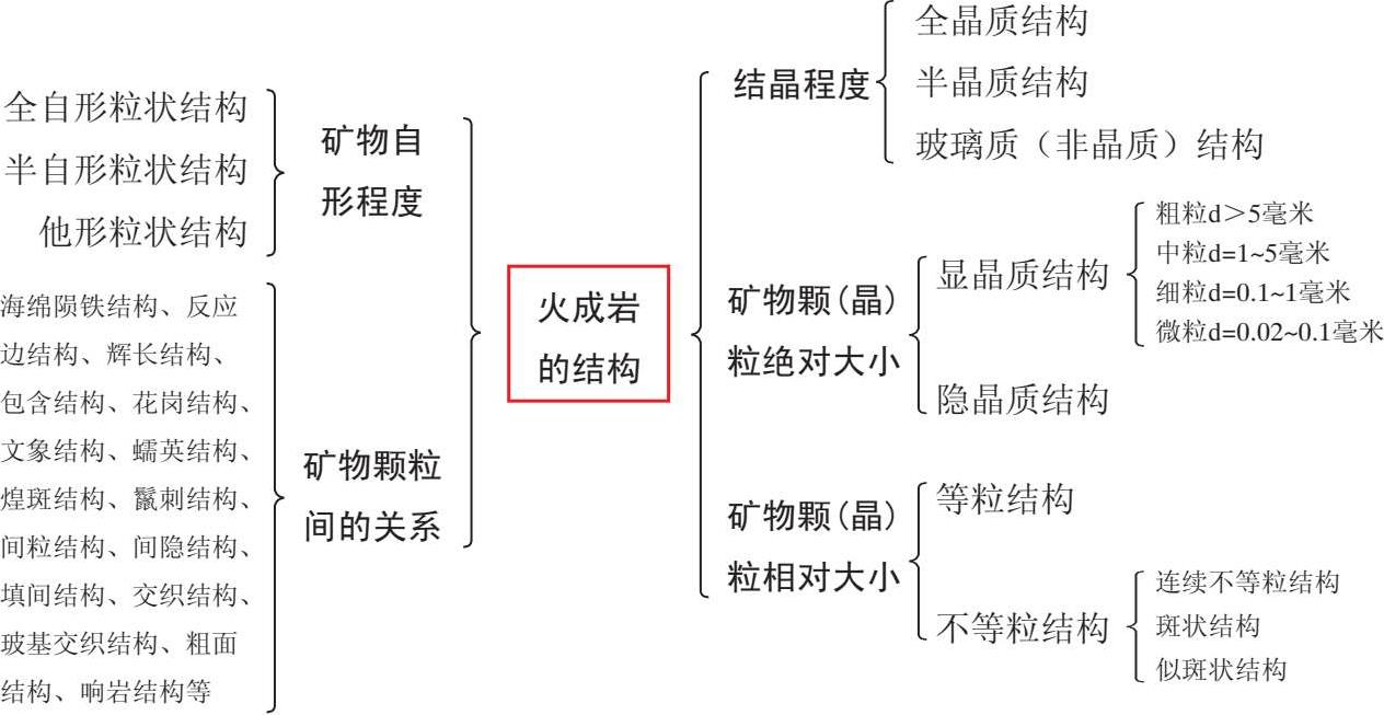 结构指组成岩石的矿物颗粒本身的特点(结晶程度、晶粒大小、晶粒形状等)及颗粒之间的相互关系反映出的岩石构成特征,侧重于强调矿物个体的特征。火成岩的结构主要反映岩浆固结过程中的热力学环境。