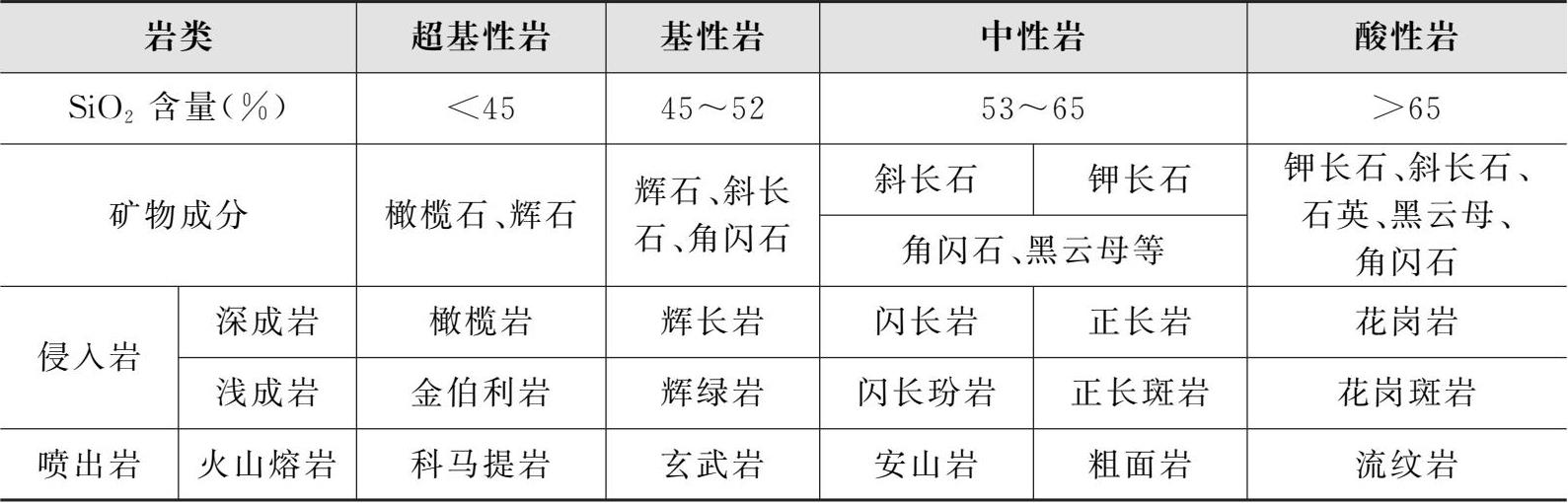 根据形成火成岩的岩浆中的SiO 2 含量,可将火成岩分为超基性岩、基性岩、中性岩和酸性岩。根据火成岩的成岩环境,可以将火成岩分为侵入岩和喷出岩。