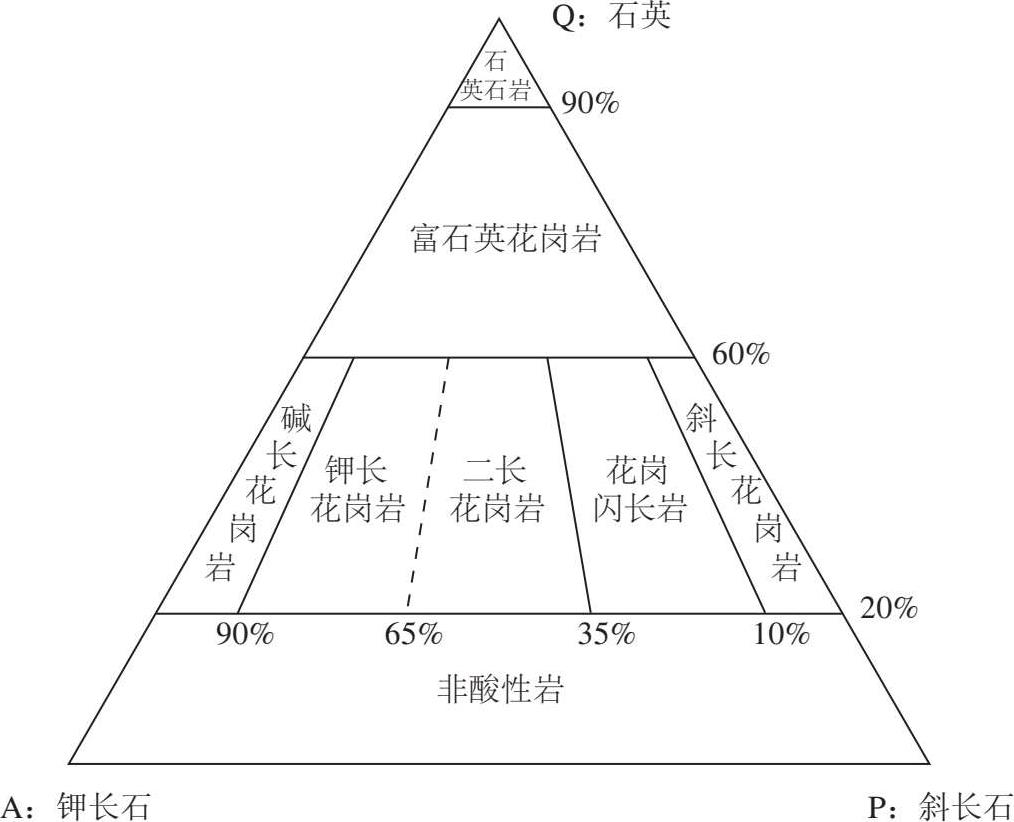 花岗岩 是自然界中分布最广的侵入岩,主要位于大陆地壳,约占大陆地壳体积的50%。花岗岩种类繁多,组成矿物主要为石英、碱性长石和酸性长石,三者占组成矿物总量的90%以上;铁镁矿物含量低于10%,主要为黑云母或少量角闪石和辉石。花岗岩典型结构为花岗结构,可细分为粗粒、中粒和细粒,在浅成环境中常见斑状结构;常呈块状构造,在岩体边缘也可由于包含捕虏体或暗色包体而呈斑杂构造,浅成环境中还可呈晶洞构造。花岗岩按斜长石含量可以细分为富石英花岗岩、碱长花岗岩、钾长花岗岩(普通花岗岩)、二长花岗岩、花岗闪长岩、斜长花岗岩等(图2-7)。