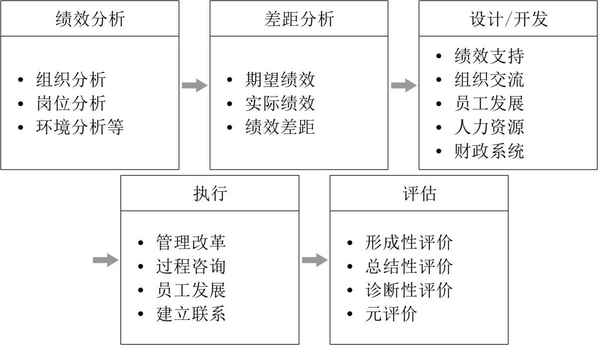③设计/开发阶段。该阶段需要形成有助于缩小绩效差距的方案。根据差距分析阶段的结果,识别导致差距的关键因素后,针对各项差距原因输出具体的解决方法,如培训、新的工作流程、工作环境再设计、新的经济补偿制度等,再将不同的方法进行组合,形成完整的解决方案。