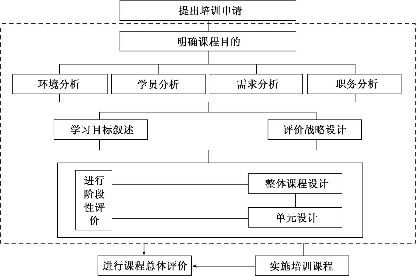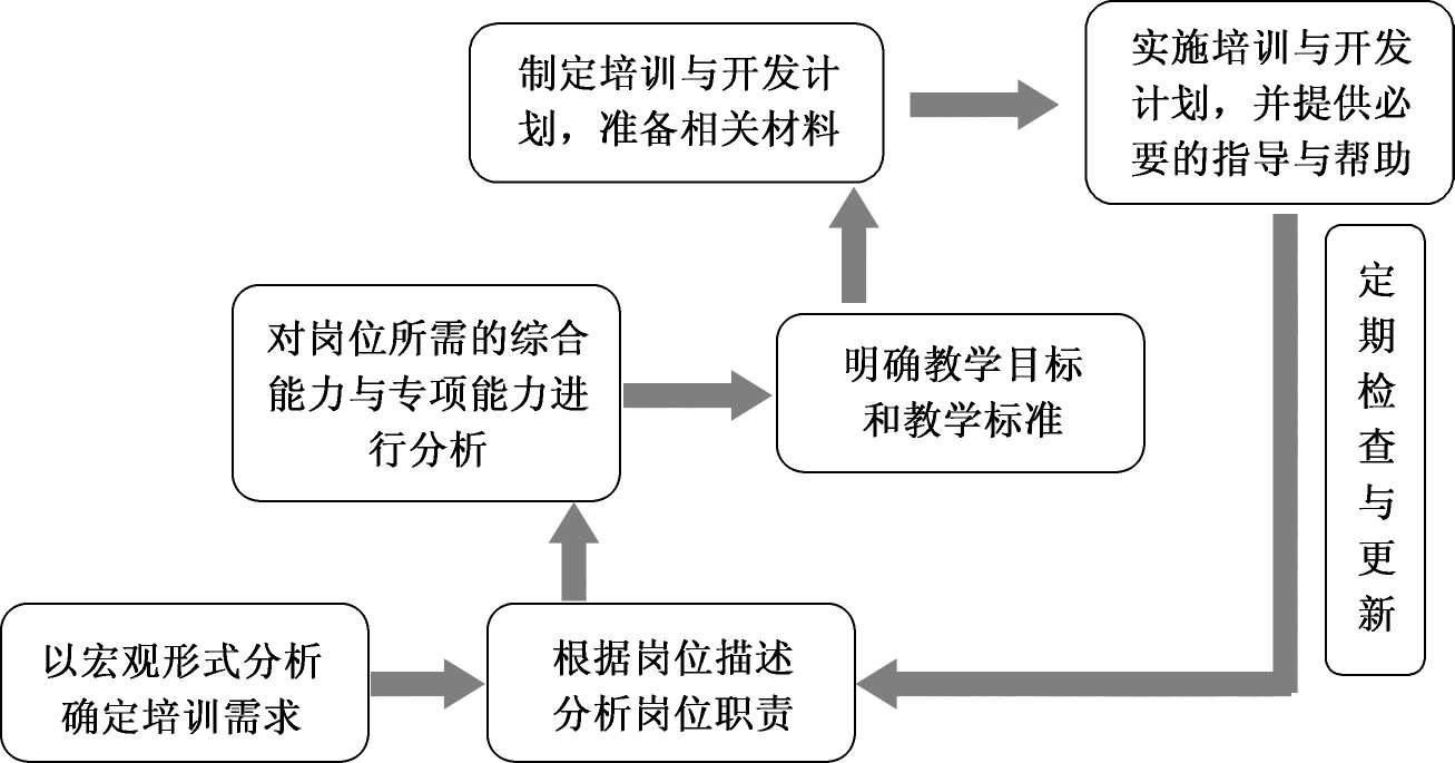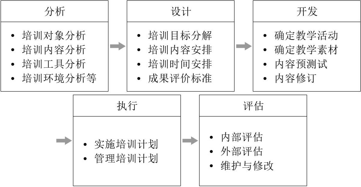 ⑤评估阶段。此阶段需要对整个培训与开发过程进行评价。评价的内容包括:教学活动评价、教学材料评价、教学过程评价、学习者的反应、学习者的成果等方面。可以通过管理者进行评价,也可以通过外部专家进行评价。对效果较好的教学活动和素材予以总结、保留,对于效果不佳的教学活动和素材,分析原因并进行改善。