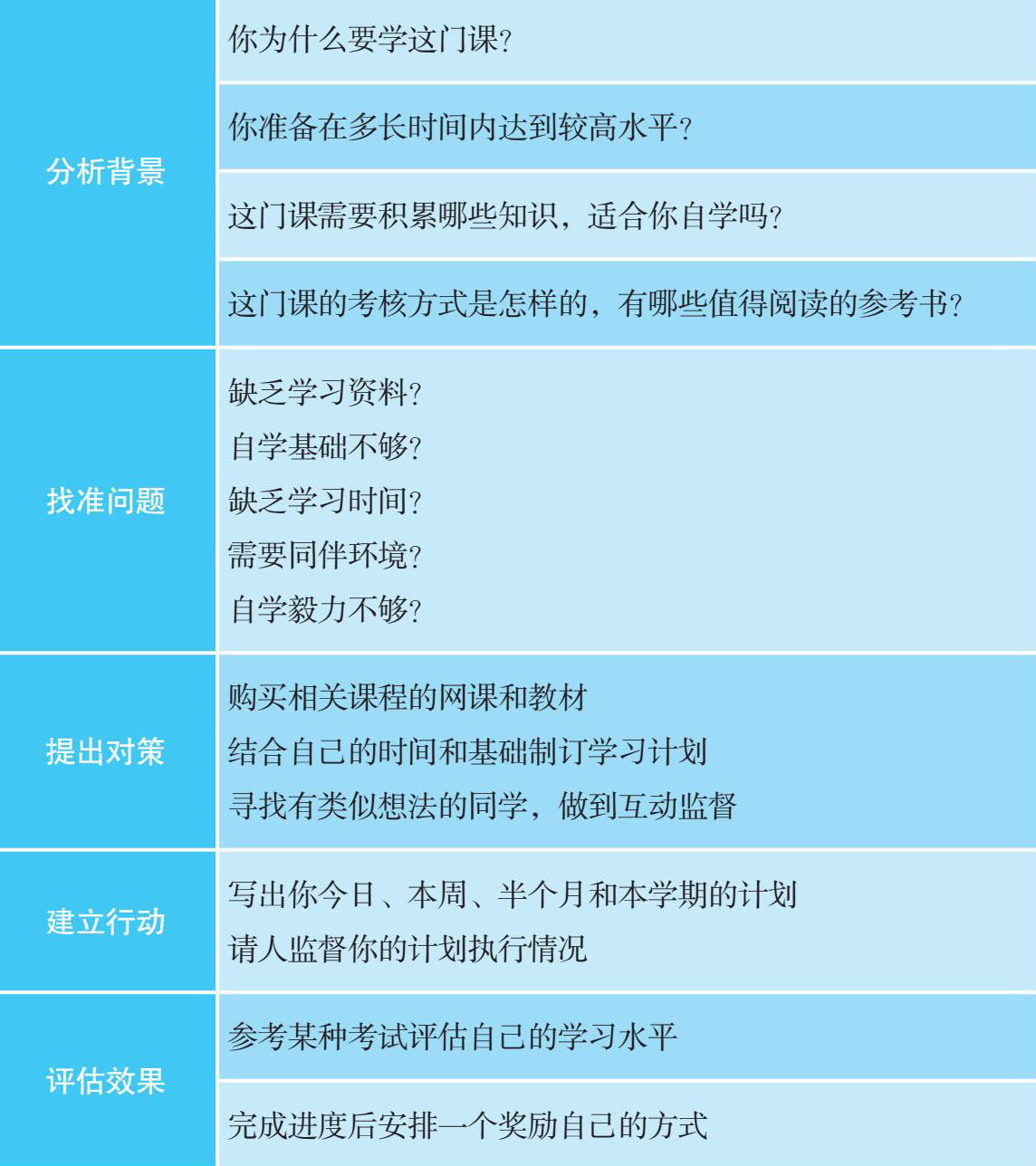 以自学一门课为例,我们可以按照这个框架去细化我们的思考,如表2-1所示。