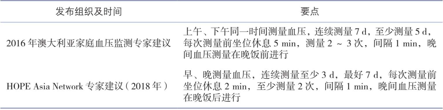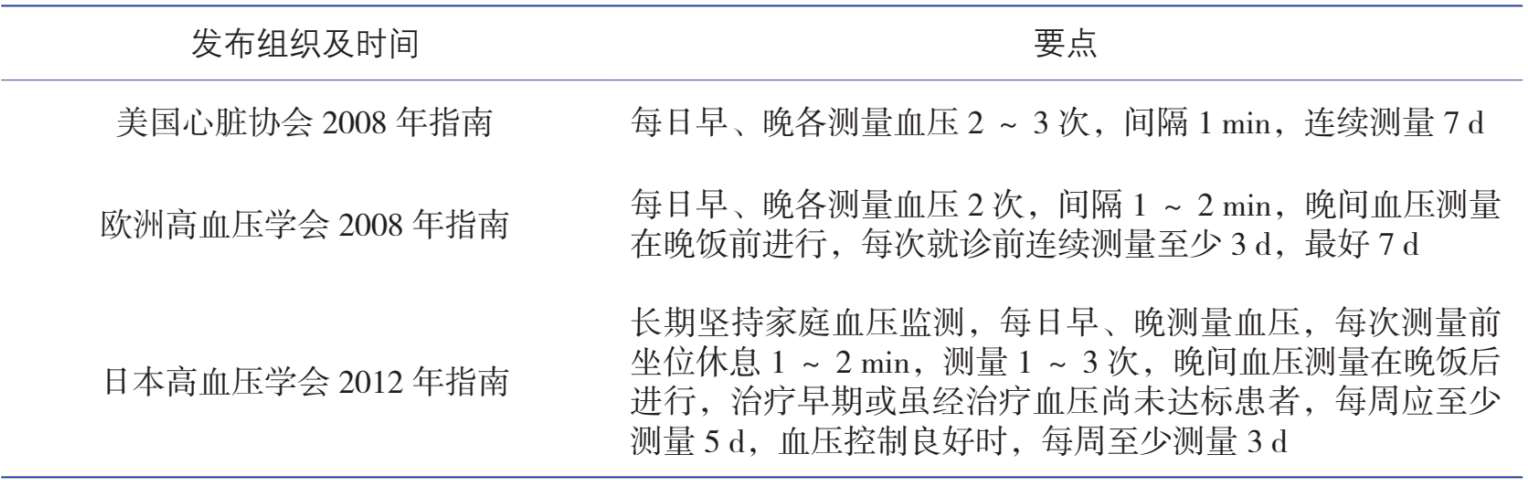 各国的指南对家庭血压监测的频次和时间做了相应推荐(表 2.4)。我国《2019 中国家庭血压监测指南》建议:每天早晚各测量 1 次血压,晨起血压应在起床后 1 h内进行,并在服药降压药物、早餐和剧烈活动之前,晚上血压测量应在晚饭后入睡前进行;每次测量前应坐位休息 5 min,每次测量应重复 2 ~ 3 次,间隔 1 min,取平均值;测血压前应排空膀胱。初诊、治疗早期或虽经治疗但血压未达标者,应在就诊前连续测量 5 ~ 7 d;血压控制良好者,每周至少测 1 d。普通人每年至少测量 1 次血压;血压水平较高但未达高血压诊断标准者,每月至少测量 1 次血压。如血压计没有相应的记忆功能,血压数据应记录于笔记本上,并同时详细记录测量血压者姓名、测量日期与时间、收缩压、舒张压和脉搏以及起床、上床睡觉时间,三餐时间和服药时间。伴有精神焦虑、抑郁或擅自改变治疗方案的患者不建议进行家庭血压监测。