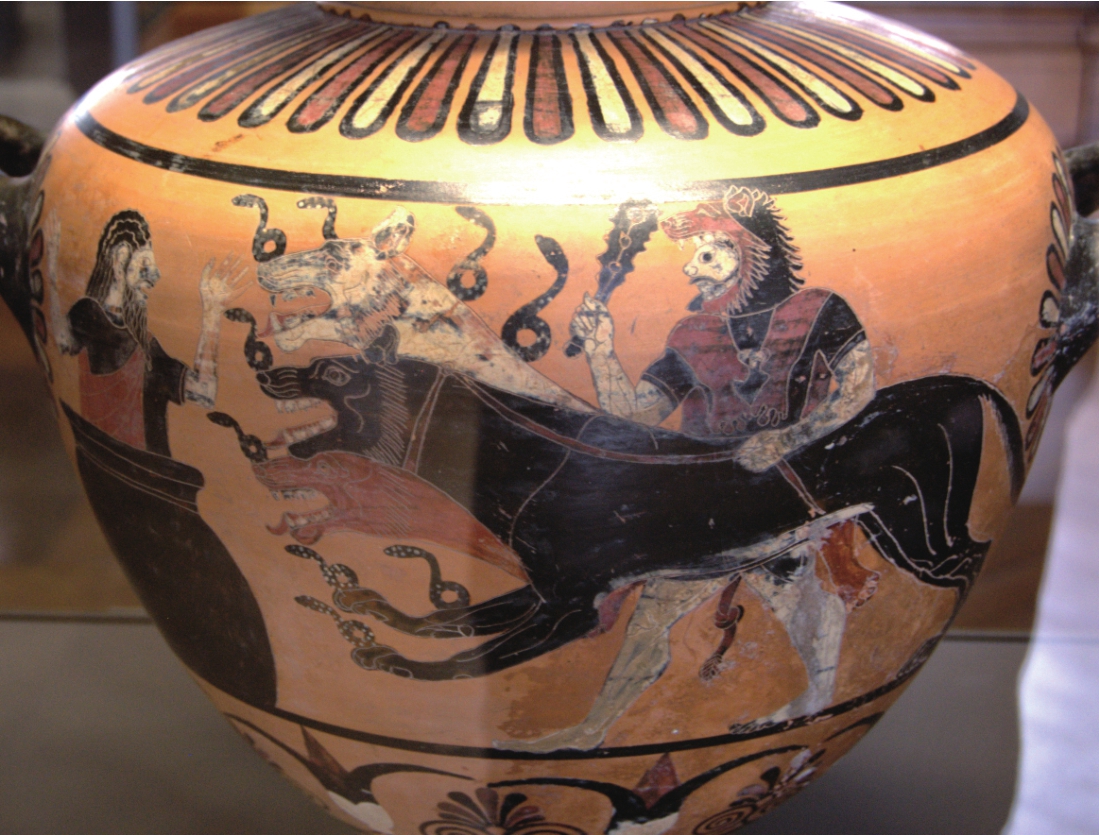 赫剌克勒斯生前将三头犬刻耳柏洛斯带到欧律斯透斯面前