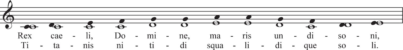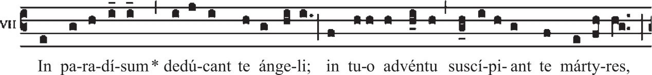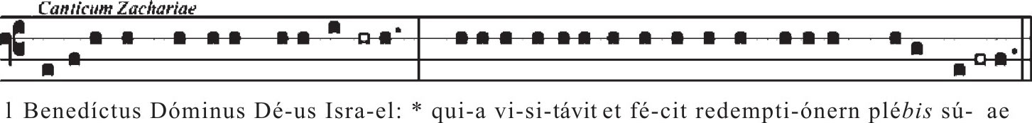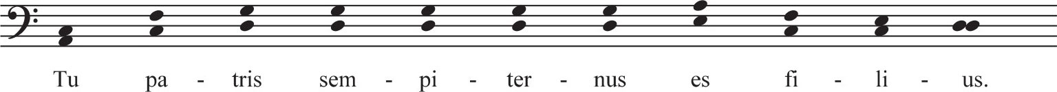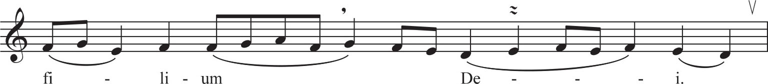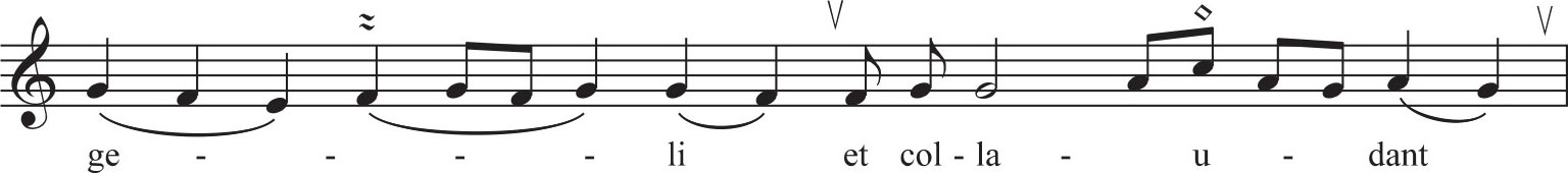 音节式的特征为每一个歌词音节对应一个旋律音(见例1);纽姆式为一个歌词音节对应一个短小音串,音串一般由三至五个旋律音构成,这种音串也被称为纽姆(见例2);花唱式的特点则是一个歌词音节对应一段花唱旋律,一段花唱旋律可由十几个甚至几十个旋律音构成(见例3)。另外,吟诵诗篇歌时使用的是一种简单公式化的吟诵调(见例4),这种吟诵调属于音节式的词曲搭配风格,但是一般曲中的旋律音都相同,只在句首和句尾处有公式化的简单的旋律变化。从旋律特征来看,吟诵调的应用与后来歌剧宣叙调的形成存在着千丝万缕的联系。