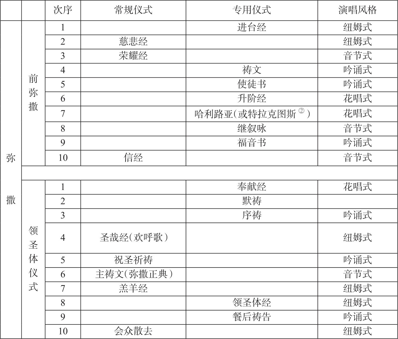 弥撒是与日课并行不悖的另一种宗教仪式活动,它在音乐领域的研究意义比日课更为重大。弥撒约在6世纪开始形成,至约10世纪才逐渐确立为一套相对固定的礼仪过程,整个过程分为两大部分:前弥撒和领圣体仪式