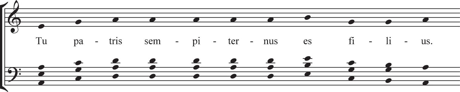 以上三种形式是奥尔伽农总的规则和编配方式。在具体作品中,基本以同度、八度、四度和五度这几种协和音程为主,