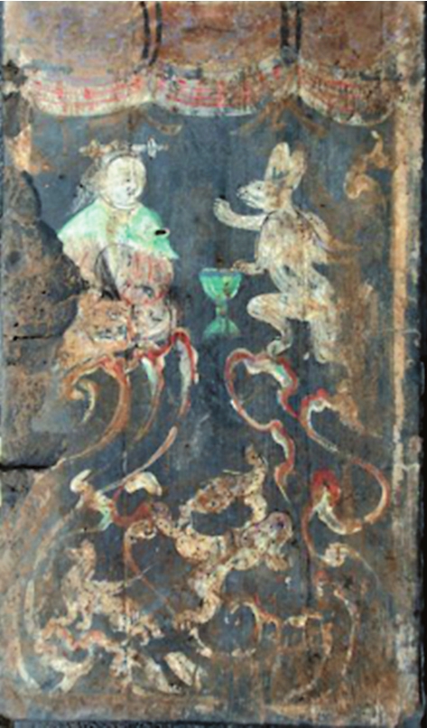 新莽时期西王母和凤凰壁画。画面上部绘有西王母和捣药玉兔,下部为蟾蜍与长着翅膀的九尾狐,两边则各绘一只毛分五彩、口衔瑞珠的凤凰。