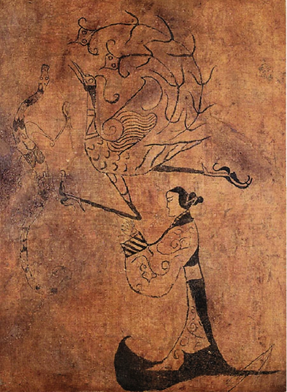 战国《人物龙凤图》,湖南省博物馆藏。此画描述的是祈求飞凤引导墓主人的灵魂早日登天升仙。