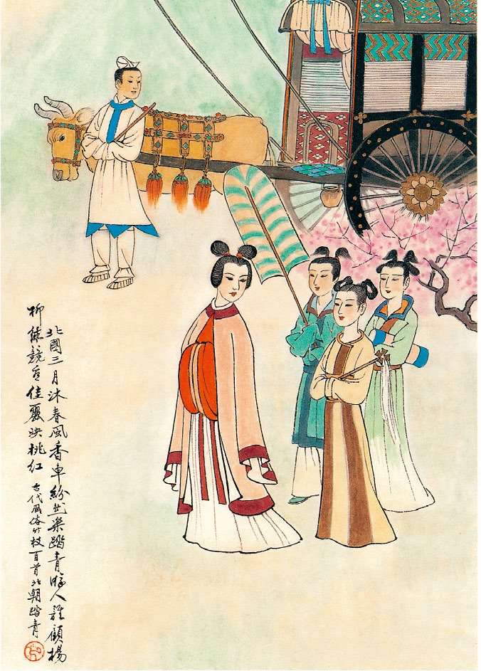 图2-3 踏青之俗早在汉代之前已经盛行,《晋书》载:每年三月初一至初三,人们外出踏青。到了唐代更为盛行,如杜甫有诗曰:“江边踏青罢,回首见旌旗”