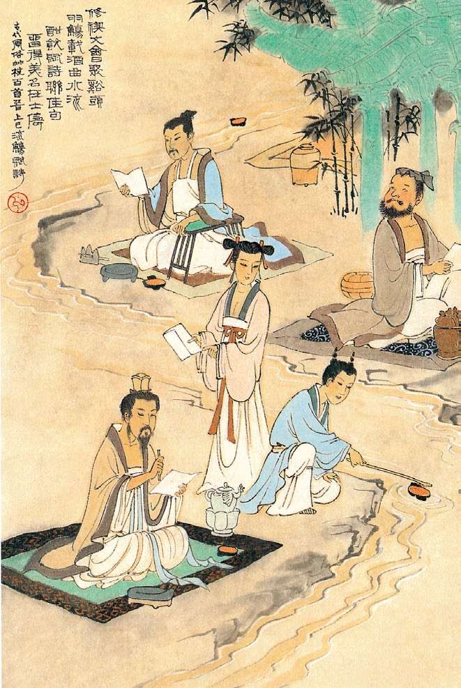 从诗文的记载来看,无论是王羲之的《兰亭集序》,还是张华的《太康六年三月三日后园会诗》,关于曲水流觞的记载的确是从晋时开始的。在东晋的“三月三”水滨活动中,曲水流觞活动是与祭祀性的祓禊活动并存的。晋陆机《三月三日》曰:“迟迟春日暮,天气柔且佳。元吉隆初巳,濯秽游黄河。” 晋成公绥《洛禊赋》曰:“考吉日,简良辰,祓除鲜禊,同会洛滨。妖童媛女,嬉游河曲。或涣纤手,或濯素足;临清流,坐砂场,列罍尊,飞羽觞。”