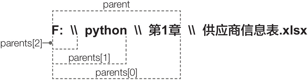 本案例要使用parents属性从路径“F:\python\第1章\供应商信息表.xlsx”中提取全部上级路径,然后用索引号提取指定级数的上级路径,演示代码如下:
