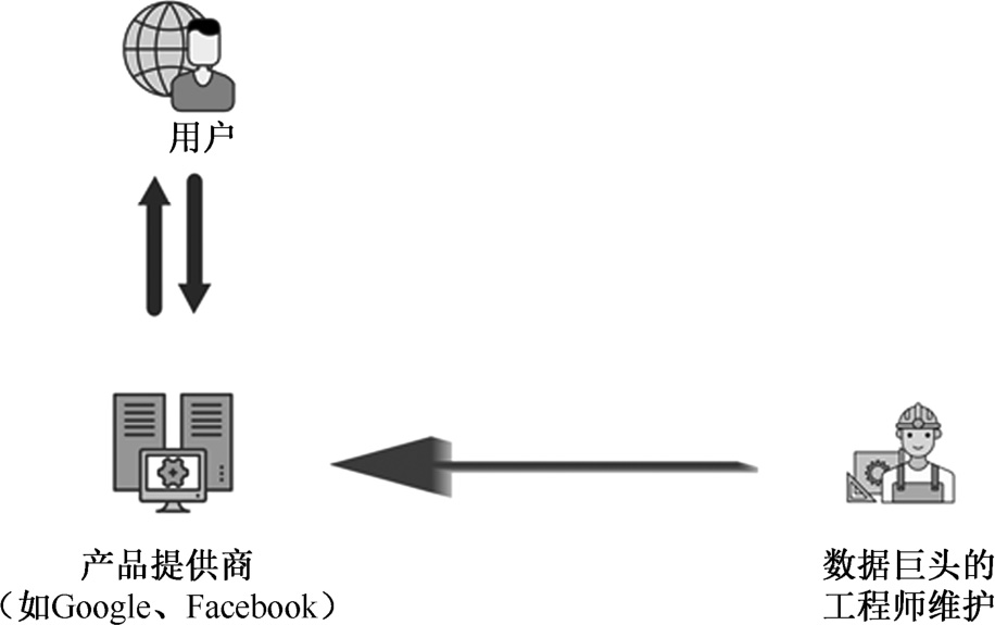 我们目前使用的各种互联网应用的集中式数据中心维护模式如图1-17所示,数据和服务器都在巨头(如Google、Facebook)的数据中心,并由工程师维护。其优点是效率高,缺点是数据巨头可以修改用户的数据。