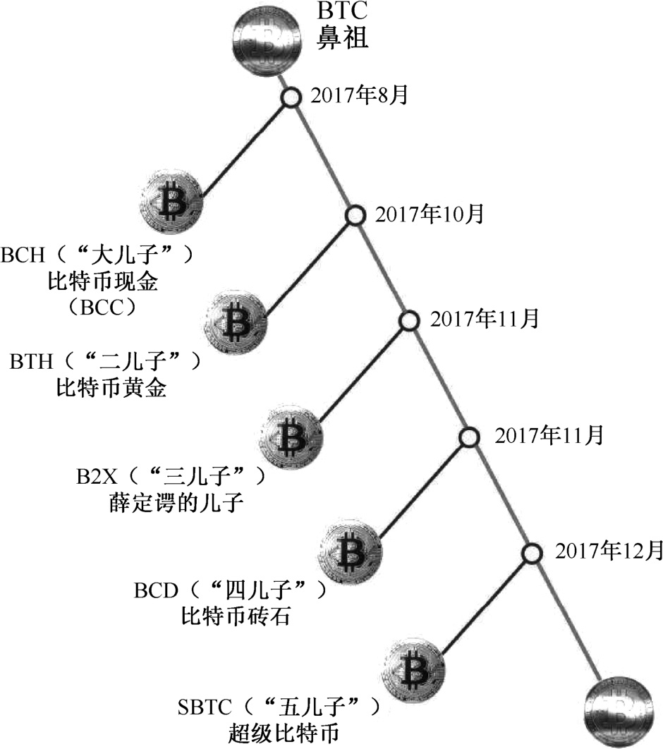 2017年8月,由ViaBTC领导的矿工团体创建了一个比特币分叉——Bitcoin Cash(简称BCH),又称比特币现金,算是比特币的“大儿子”。后来,越来越多的矿工觉得这方法不错,于是一种新的致富方法——首次分叉发行(Initial Fork Offerings,IFO)诞生了。矿工团队在创建分叉的同时,可以在发生分叉的区块中利用自己的特权,分配一些币给自己或其他人,然后再开放让所有人参与挖矿。因此,比特币不是一个人在战斗,而是有一堆“儿子”,如图1-22所示。