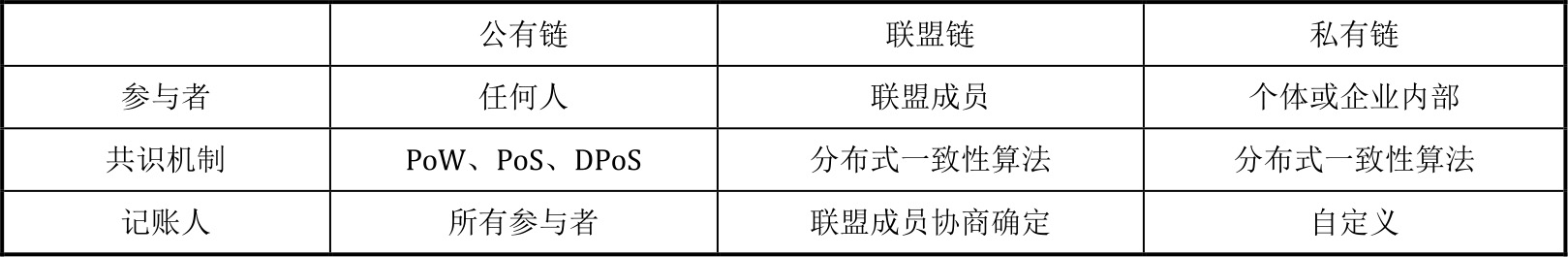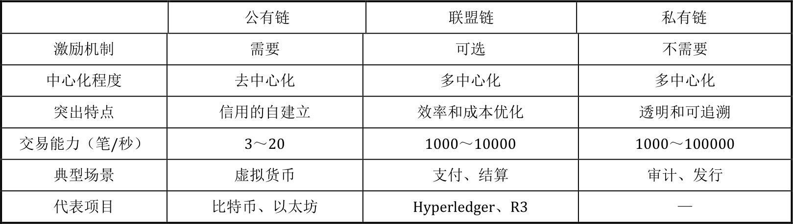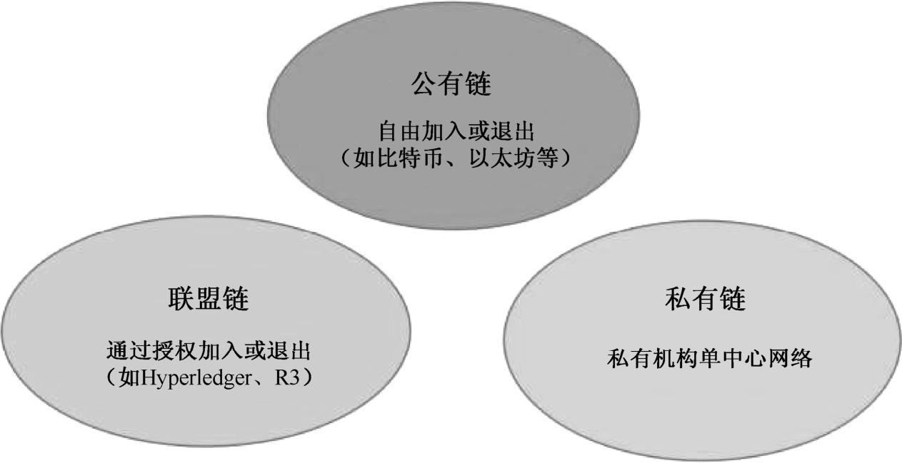 比特币是一个民间发起的项目,无数人参与其中,构建了一种独特的协作组织。因此,区块链不仅是技术的创新,还是组织模式的创新。总体来讲,根据组织范围的不同,区块链可以分为公有链、联盟链和私有链,区块链分类如图1-19所示。